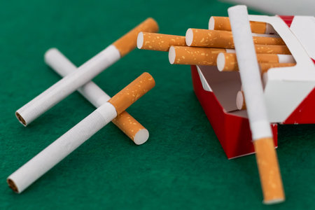Cigarette arrangement on green grungy wood surface, tobacco industry background