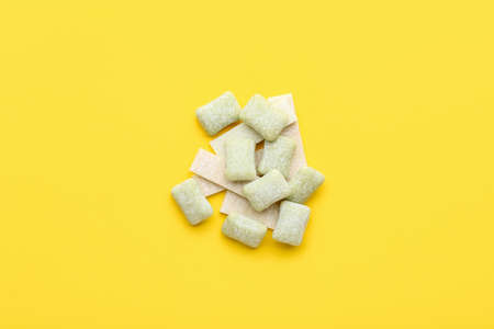 Summer vacation concept, travel. Beach accessories and stuff on a yellow background. Studio shot. Flat lay