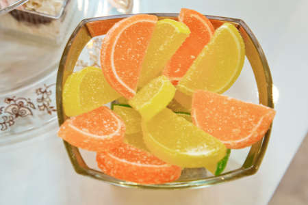 Fruit jelly candies in the form of slices of orange and lemon