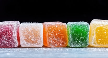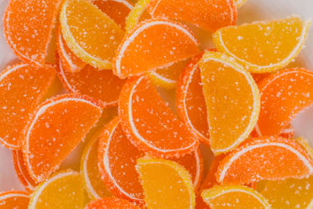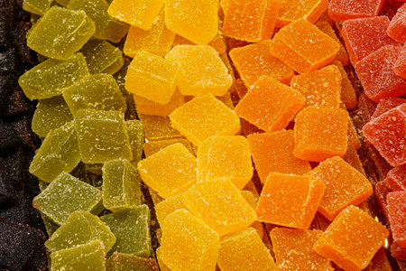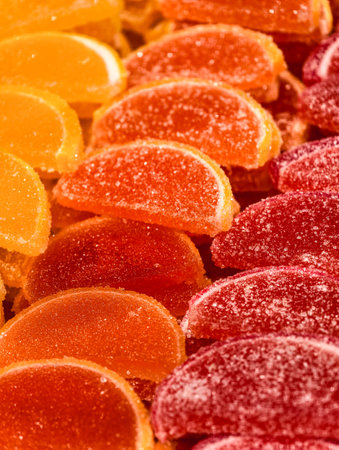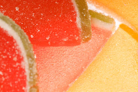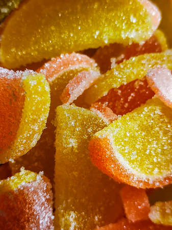 Colorful marmalade and sugar background closeup. Sweet dessert
