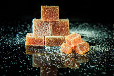 pyramid of delicious orange marmalade coated with sugar on black mirror background