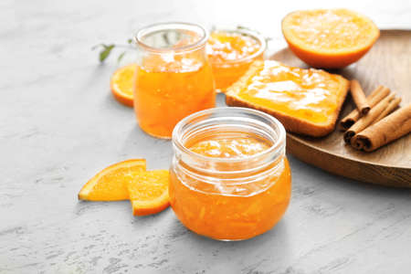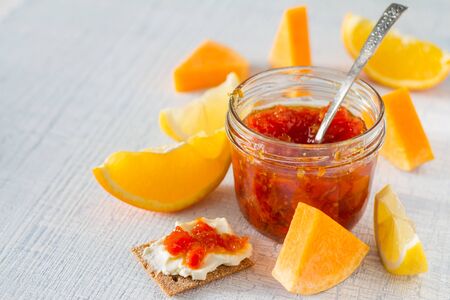 Orange jam in a glass jar on a light background, selective focus