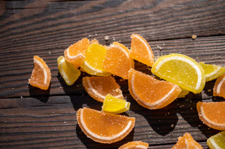 Marmalade lemon slices scattered on a wooden table in the sunlight, close-up, selective focus.