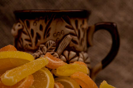 Multicolored shaped marmalade lemon slices and a ceramic tea mug, close-up, selective focus