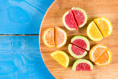 Flat lay jelly candies on the wooden board above blue wooden background