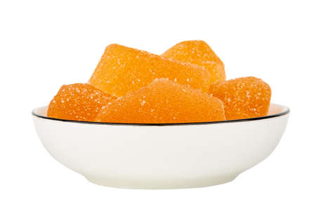 Orange color marmalades in white glass bowl isolated on white background. Side view
