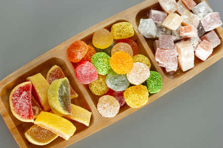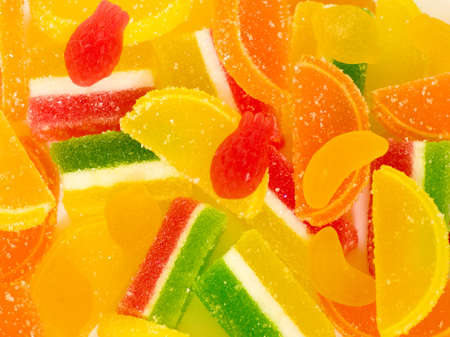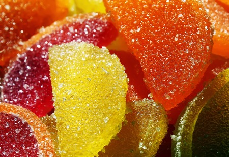 Colorful candied fruit jelly candies close up as background.