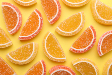 Delicious orange marmalade candies on yellow background, flat lay. Top view