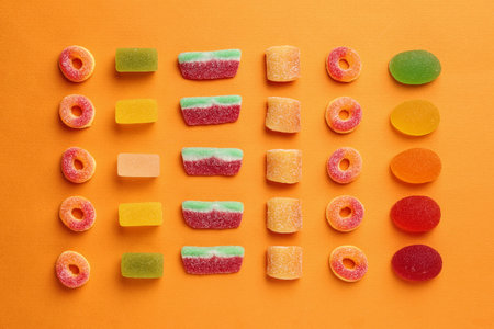 Colorful marmalade jelly candies, multi-colored soft marmalade candies background, red, yellow, orange, green and brown marmalade candies