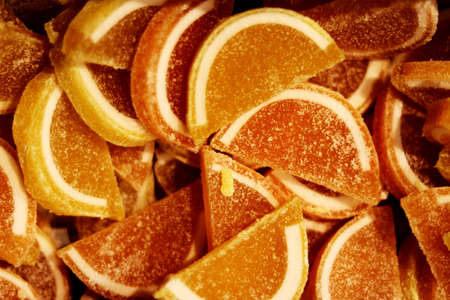 Background of gummy candies in the form of orange and lemon slices.
