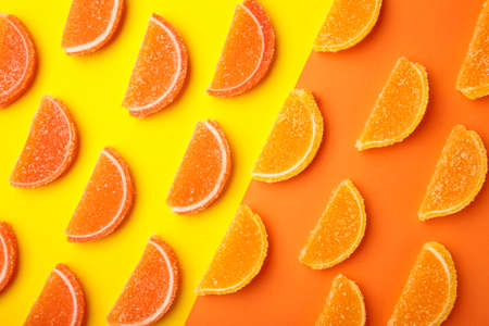 Marmalade in shape of citrus fruits slices on colored background close-up, top view