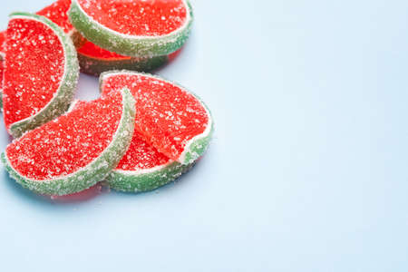 Jelly candies. Watermelon jelly candies sprinkled with sugar on a light blue background with copy space. Watermelon marmalade. Selective soft focus. Organic products.