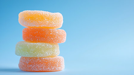 Stack of colorful jelly candies on blue background with copy space.