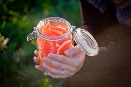 candy marmalade in a glass jar on a wooden board