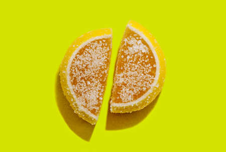 Marmalade pieces of sticky candy on a yellow background.Sweets. Marmalade slices are very similar to the sun. Marmalade candy