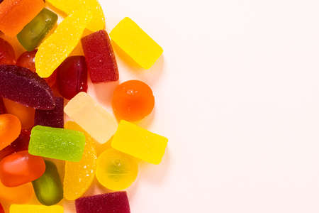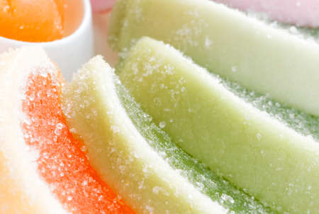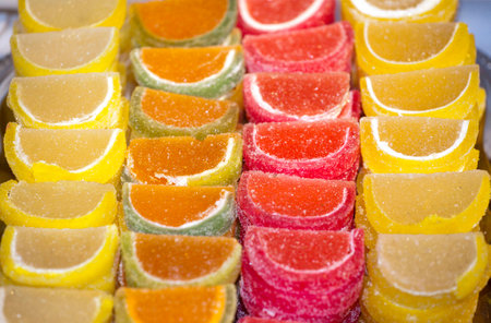 Colorful fruit jelly candies close-up macro photography with soft focus