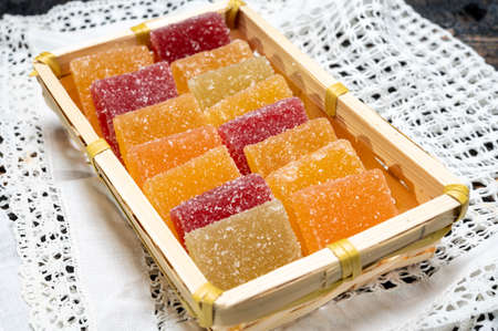 Tasty french dessert, natural colorful fruit pate jellies or madmalade