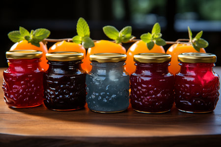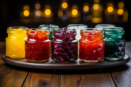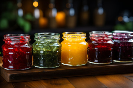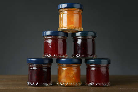 Colorful jam in glass jars on a wooden table. Selective focus.