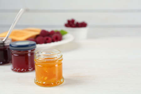 Jars of different jams and fresh ingredients on white marble table, flat lay. Space for text