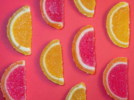 Fruit jelly in the form of orange and grapefruit slices on a red background.Sweets on the table. Background from marmalade