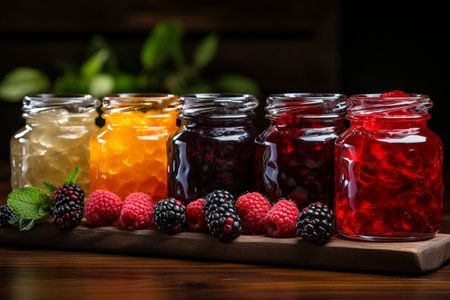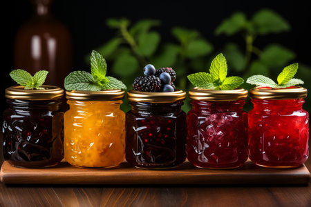 Variety of jams in glass jars with fresh berries and mint on wooden table