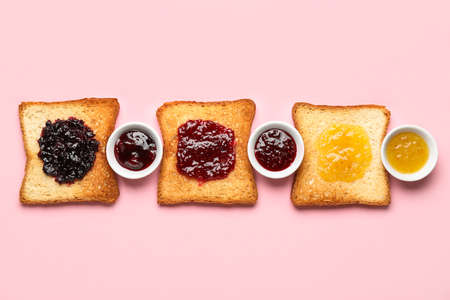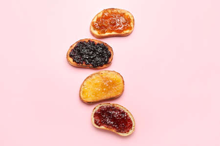 Jam toast for breakfast. Set of toast with different jams on dark wooden background top view space for text
