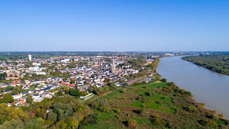 Aerial view of Saintes on Charente river with medieval cathedral, France