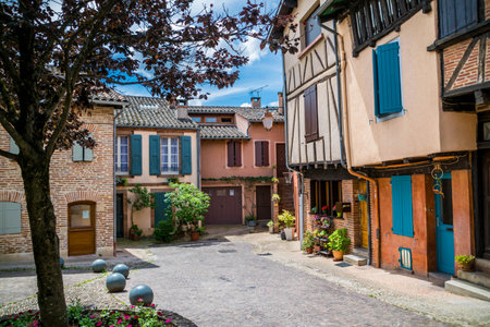 Monflanquin, France - October 17, 2021: architectural detail of typical houses in the city center on an autumn day