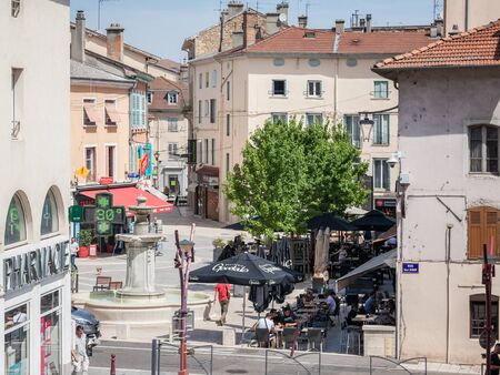 BOURGOIN-JALLIEU, FRANCE - JULY 17, 2019: Place du 23 Aout 1944 Square, a pedestrian square with cafes and bars, in the center of Bourgoin, a typical town of French Dauphine region