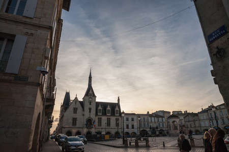 LIBOURNE, FRANCE - FEBRUARY 23, 2022: Place Abel Surchamp Square, a medieval square with the city hall, in the city center of Libourne, a major town of Gironde, in Aquitaine region.