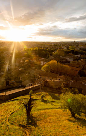 Spectacular sunset in Carcassonne. View from medieval village on town in bottom.Verticall full frame crop