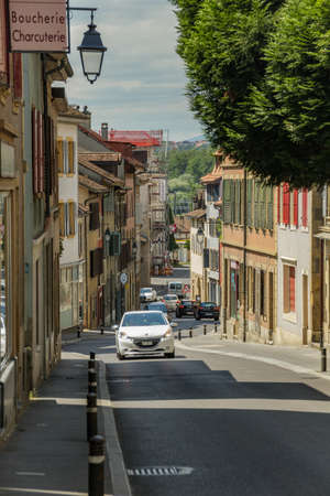 Yverdon-les-Bains, Switzerland - 26 June 2016: Quiet unhurried streets of a small Swiss town. Municipality in the district of Jura-Nord vaudois of the canton of Vaud in Switzerland.