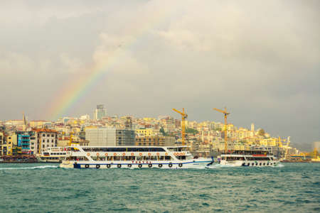 ISTANBUL, TURKEY - OCTOBER 2018: Beautiful views of the sea, houses, cranes and rainbow. Tourist Istanbul city landscape.