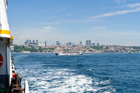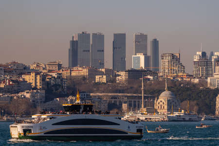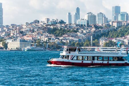 Ferry boat passing Bosphorus. panorama of european part of Istanbul city at background, Besiktas area