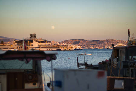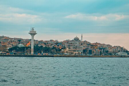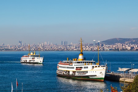 Travel to Istanbul background photo. Ferry and cityscape of Istanbul view from Kadikoy district.
