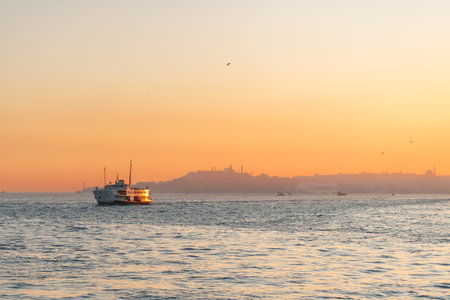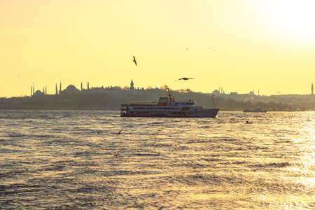 a transportation ship in bosphorus and golden sunset over istanbul historic peninsula