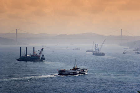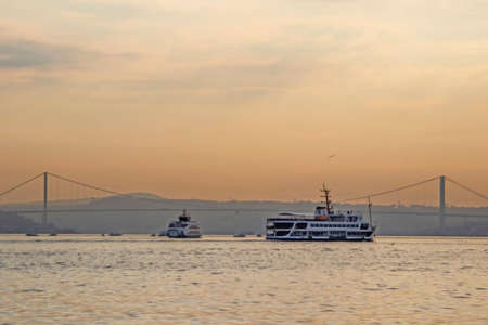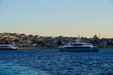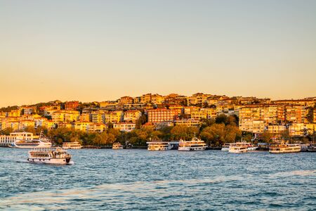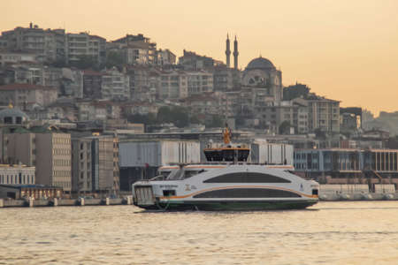 Ferry and Cityscape of Istanbul at sunset. Istanbul background photo. Istanbul city line ferries. Travel to Turkey.