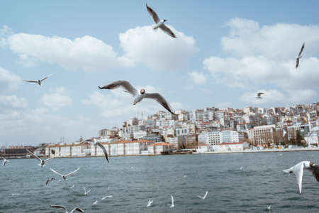 close up of seagulls flying around the bosphorus straits in istanbul turkey