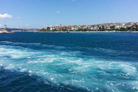 Bubbling blue waves of traces of tourist cruise ships passing on the Bosporus. Water trail foaming behind a passenger ferry boat in Bosphorus, Istanbul, Turkey.