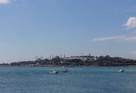 Istanbul in the Bosphorus Fishing boats in the sea in the back area, Sultan Ahmet Mosque and Hagia Sophia Mosque