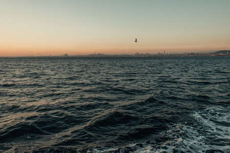 Amazing view of Istanbul city from the sea befor sunset, Bosporus strait, Turkey. View of the Galata tower.