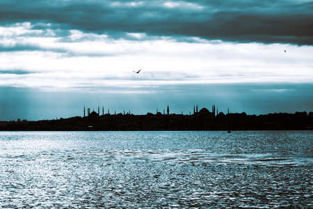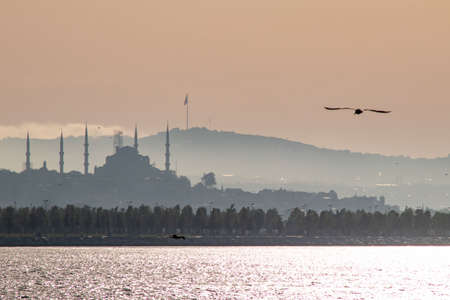 istanbul, turkey-may 25,2021.The silhouette of Istanbul's mosques from the Yedikule coast in the early morning.