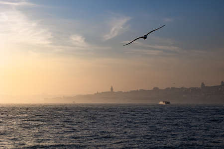 Istanbul view. Cityscape of Istanbul at foggy weather with a seagull. Galata tower and a ferry on the background.