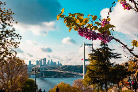 Istanbul in spring. Cityscape of Istanbul and judas tree or erguvan in spring.