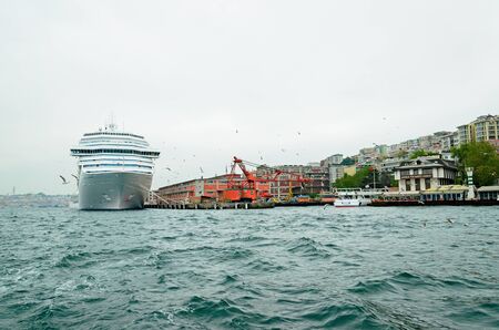 A cruise ship crossing the Bosphorus Strait of Istanbul of Turkey, part of the continental boundary between Europe and Asia,