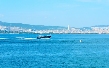 Yacht in sea with coast and sunset sky at background, Istanbul, Turkey