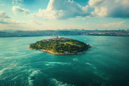 A picturesque island sits amidst sparkling waters, displaying lush greenery and historical structures.
