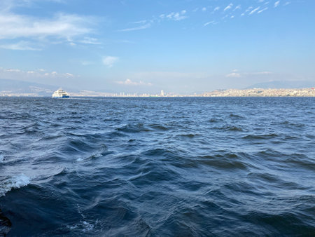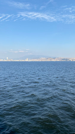 Panoramic view of Izmir Gulf and Izmir Harbor from Bostanli coast. Izmir, Turkey