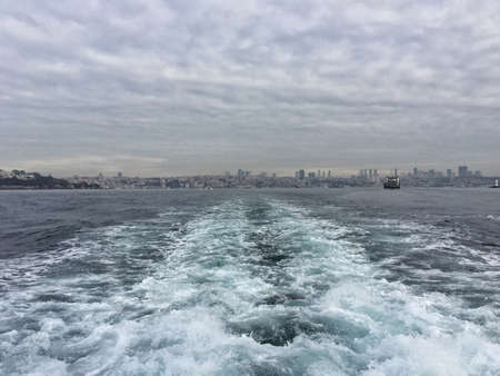 Bubbling blue waves of traces of tourist cruise ships passing on the Bosporus. Water trail foaming behind a passenger ferry boat in Bosphorus, Istanbul, Turkey.