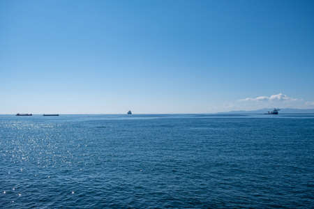 cargo vessels in sea over cloudless sky